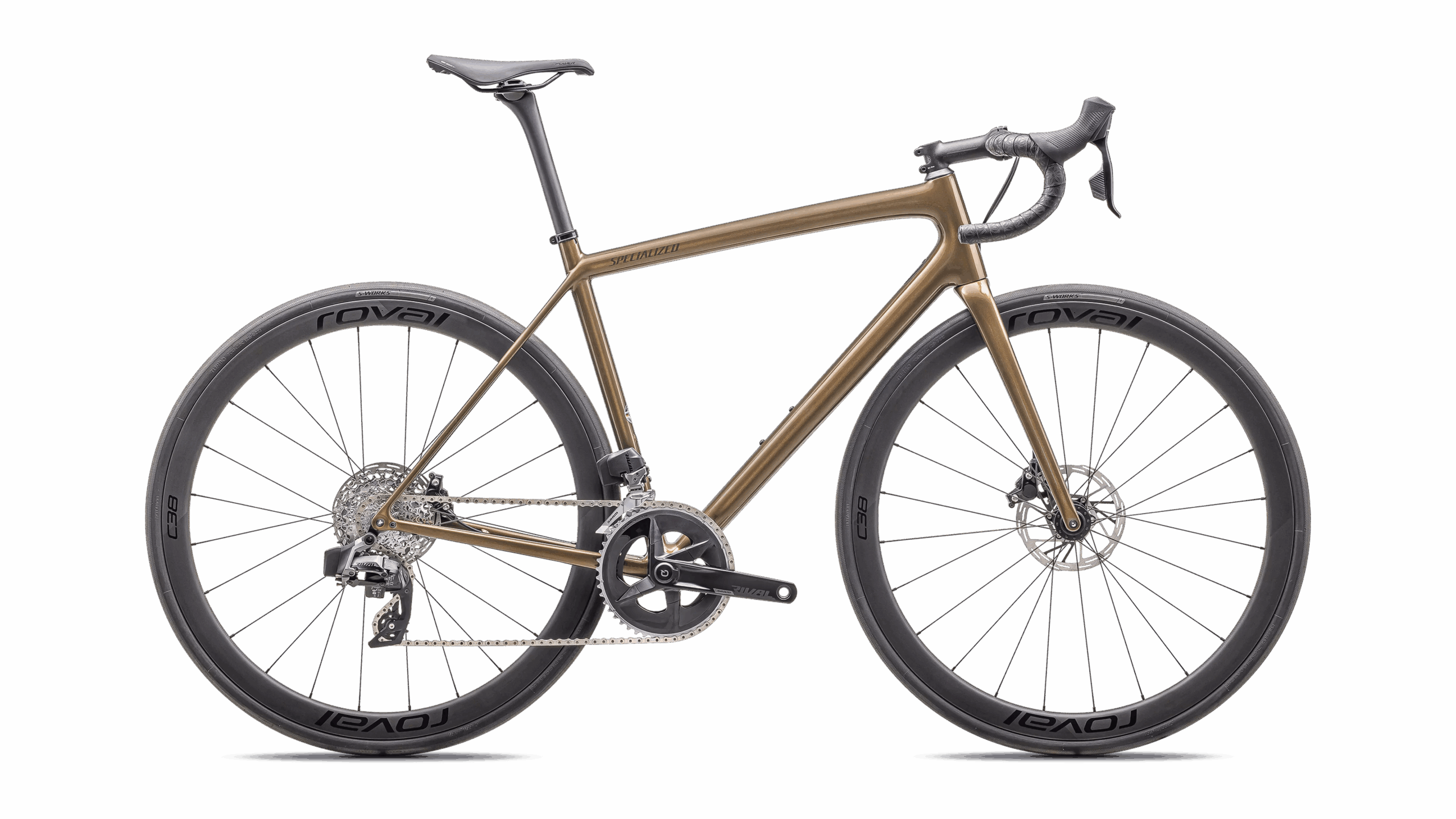 Langaton SRAM Rival eTap AXS -sähköinen voimansiirto ja hydrauliset levyjarrut yhdistettynä pomminvarmoihin Roval C38 Disc -hiilikuituvanteisiin, sinulla on täydellinen kulkupeli tien päälle.