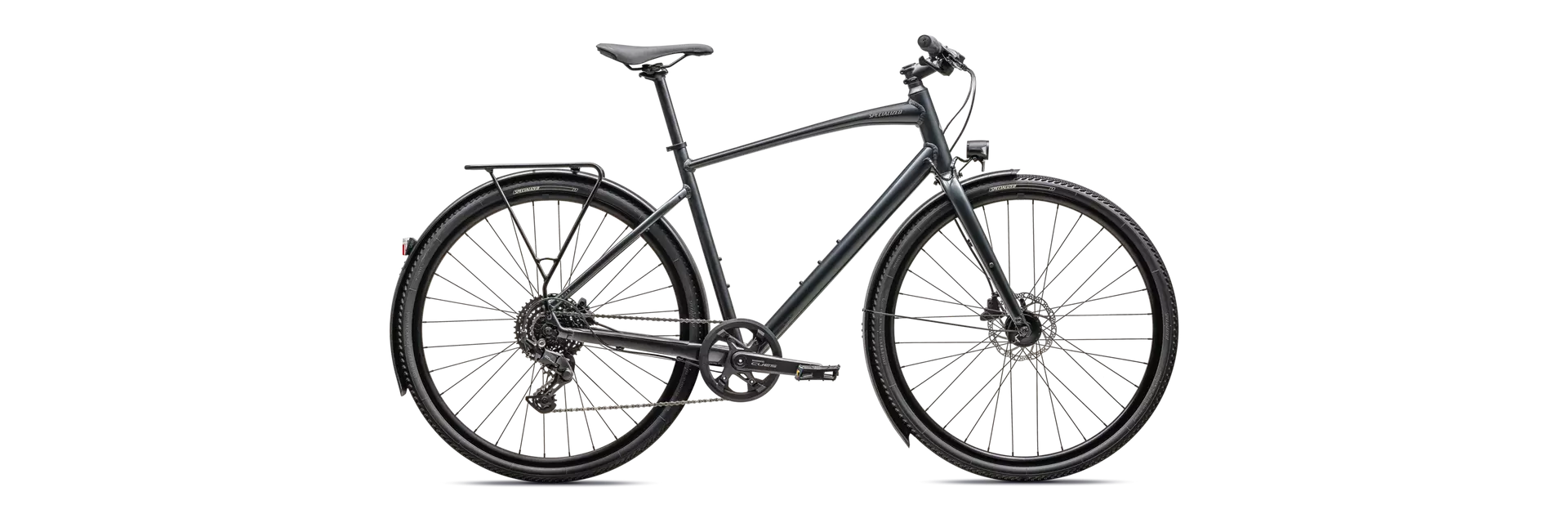 Specialized A1 Premium Aluminum, Fitness Geometry, butted tubing, internal cable routing, flat-mount disc, quick-release, Plug + Play rack/fender mounts