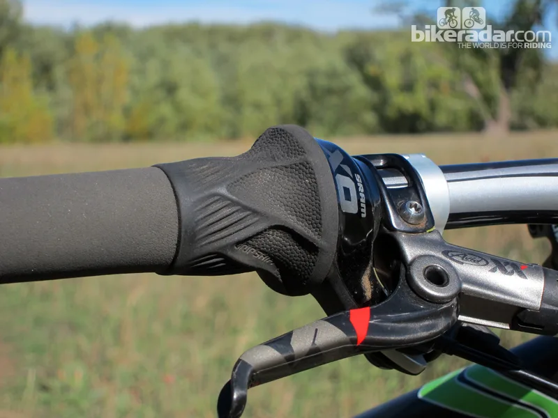 2×10-voimansiirron suorempi ketjulinja on mahdollistanut SRAMille etuvaihtajien "trimmaus"-toiminnon poistamisen, mikä on luonut yksinkertaisimman kaksiasentoisen etuvaihtajan, jota olemme käyttäneet. Jaws-kahvan ansiosta vahingossa tapahtuva vaihde ei ole mahdollista, sillä se tarjoaa runsaasti käsitilaa. Tämä ohjaustangon kahva tarjoaa tahmean tuntuman ja tukevan otteen, mutta ne, jotka pitävät pehmeämmästä, iskuja vaimentavasta otteesta, saattavat haluta erilaisen otteen – yksinkertaisen, kunhan haluamasi kahva voidaan lyhentää sopivan pituiseksi. Kädensijat sisältyvät pakettiin.